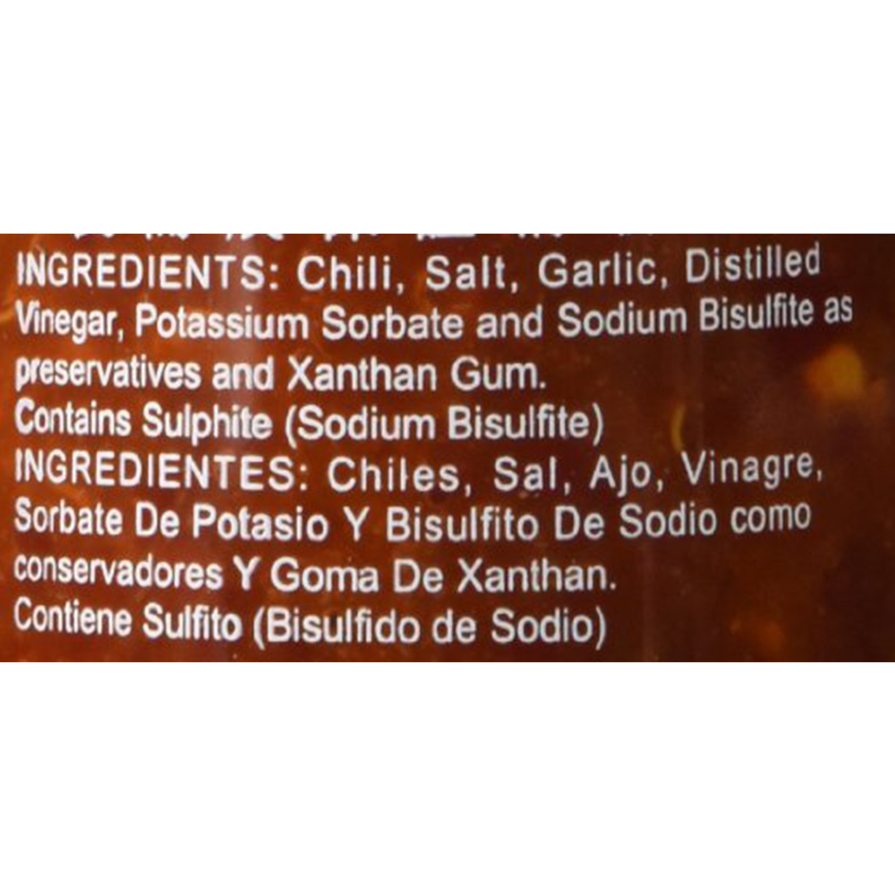 INGREDIENTS: Chilli Garlic Salt Vinegar Pottasium sorbate and sodium bisulfite as presevative